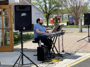 John set up his keyboard just outside the main entrance and placed several large speakers nearby.